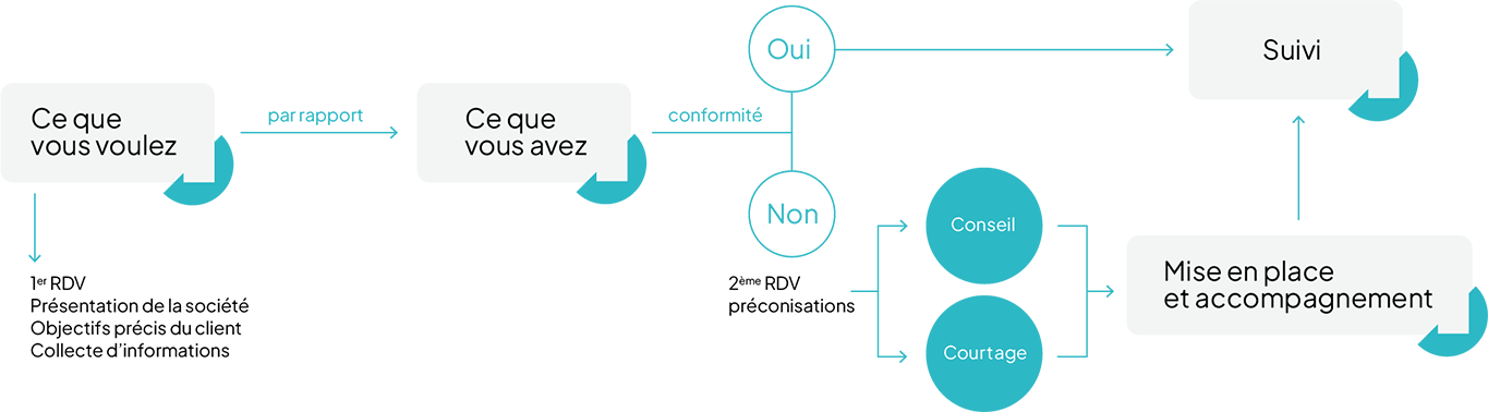 Après validation, nous assurons le conseil, le courtage et la mise en place des solutions retenues.